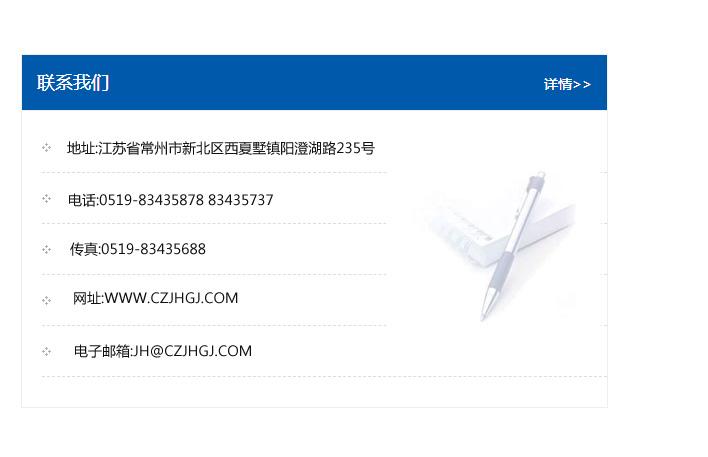 地址:常州市新北區友邦商務大廈1幢16、17層  電話:0519-85101652  傳真:0519-85112595  郵編:213022  網址:www_cz-jiayue_cn.668yule.com  郵箱:xiajifengaa@163.com
